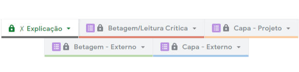 A planilha é dividida em abas: A de explicação (que contém de forma resumida a utilização da planilha), betagem/leitura crítica do projeto, capa do projeto, capa de pedido externo e betagem de pedido externo, segue foto abaixo: